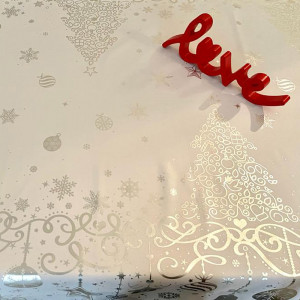 La nappe de NOEL GRISE ET ARGENT est anti tâche et sans repassage, 100 % polyester, et finition biais.