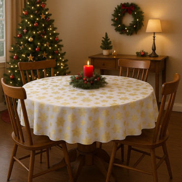 La nappe ronde bloomy blanc or mesure 1m80, elle est anti tache et sans repassage.