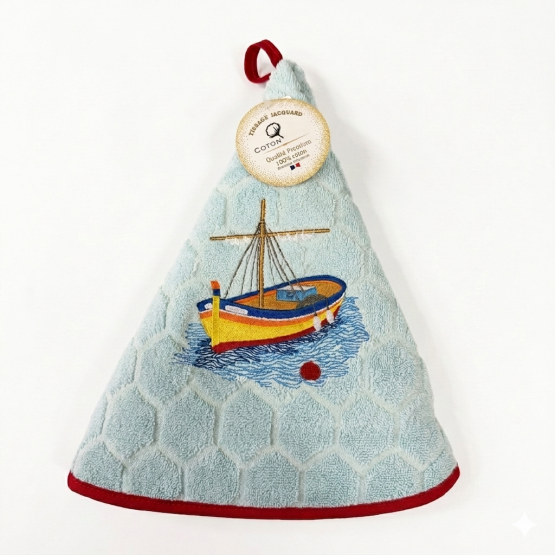 Son tissage jacquard apporte du relief et un design raffiné, sublimé par une broderie décorative représentant un bateau, pour une ambiance marine chaleureuse. Sa forme ronde et sa finition pointue lui donnent un style original et pratique.