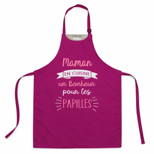 Apportez une touche de bonne humeur en cuisine avec ce joli tablier en coton. Orné du message tendre et gourmand « Maman en cuisine, un bonheur pour les papilles », il est parfait pour toutes les mamans qui aiment régaler leurs proches.